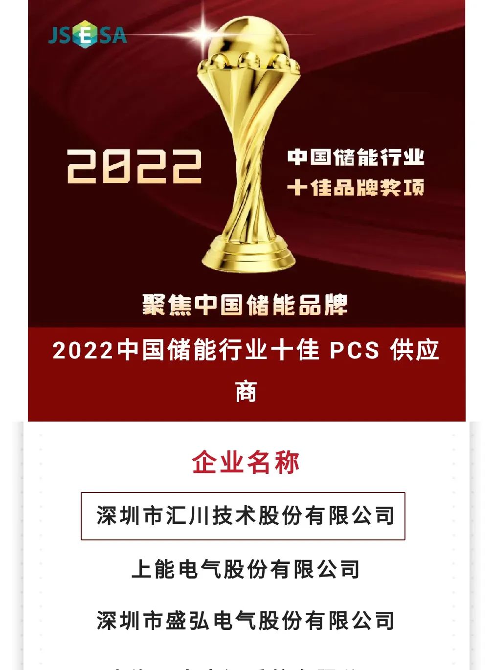 不久后,由中國(江蘇)國際儲能大會組委會與江蘇省儲能行業協會主辦的“2022中國儲能行業十佳品牌”系列獎項公益評選活動中,匯川技術在數百家企業海選中脫穎而出,成功入圍“2022中國儲能行業十佳PCS供應商”。接連斬獲儲能最佳供應商獎項,不僅是對匯川技術研發創新的肯定,也是對匯川技術綜合實力的認可。